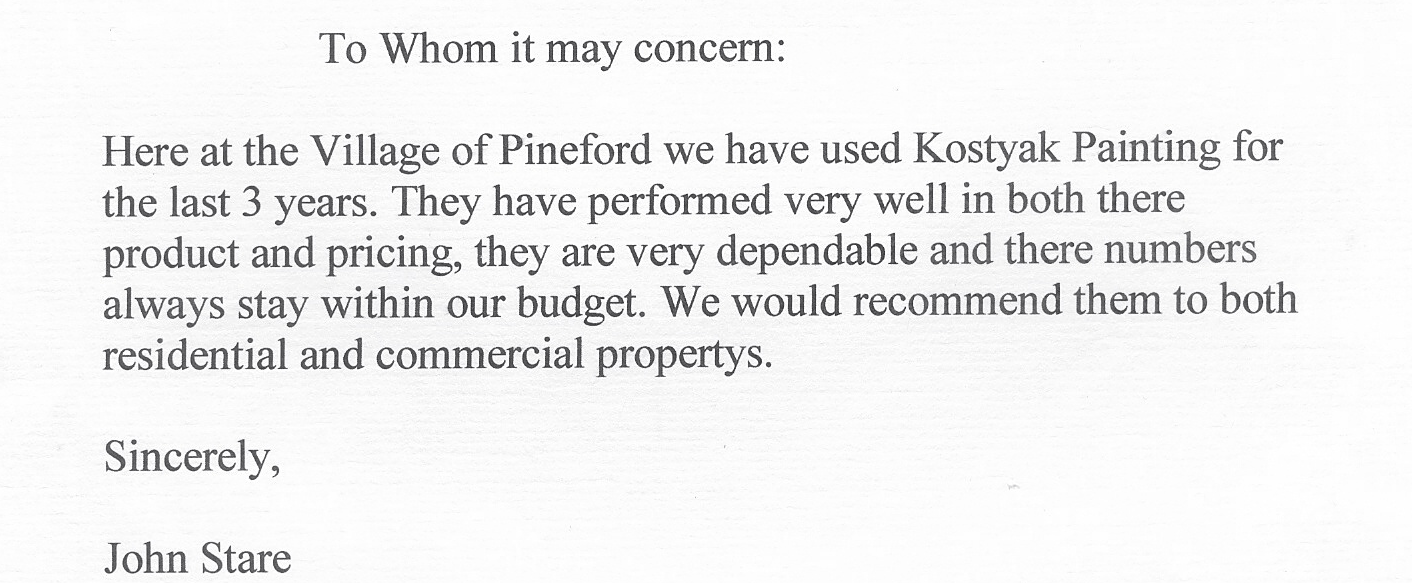 "My wife and I are the original owners of our home which we purchased in 2004. After enduring the contractor's grade paint job for about (10) years, we decided that we wanted our home's interior painted by a professional. A childhood friend got first dibs for an estimate. However, we were not satisfied with his proposal. I then located Scott Kostyak Painting in the "Yellow Pages". After researching his website, we contacted him for an estimate. Not only was he prompt in his response, Scott was very professional in interacting with us. Once we were satisfied with his estimate, we selected colors and Scott and his crew started February 12th. He had anticipated that it would take about (3) weeks to complete the job. Much to our surprise and delight, Scott and his crew of Anthony, Dave, Lee and Tim, finished painting our home after (9) work days later on February 24th. My wife and I were so impressed with how meticulous yet efficient Scott and his crew were. They all worked together safely as a team. Looking back, the longest part of this project was the planning and anticipation. Once started, it appeared to go smoothly. Yes my wife and I are pleased with the results and without hesitation would recommend Kostyak Painting for your painting needs.