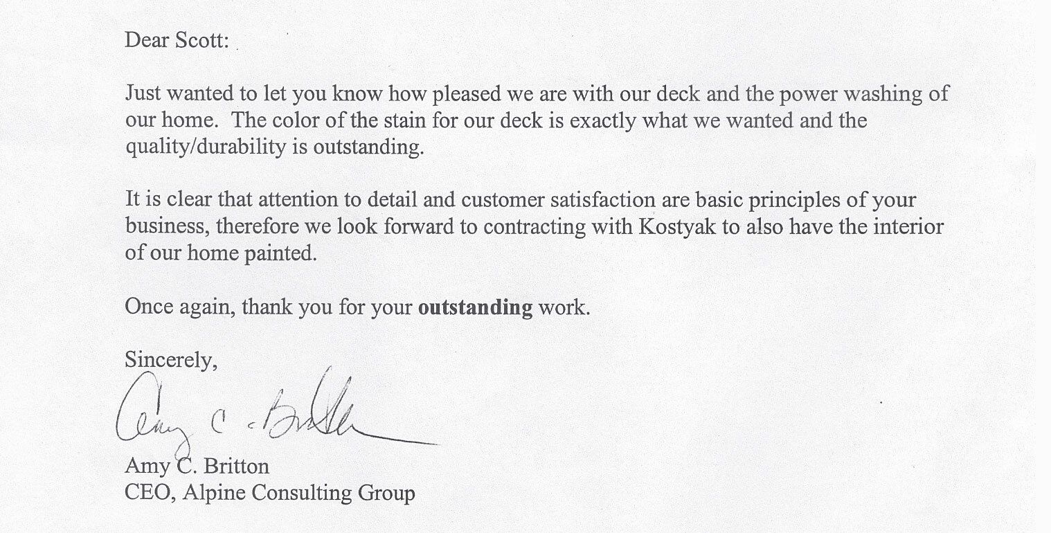 "Thanks for your work on the deck. It was a thing of beauty to see the rain bead up on the floor. Thanks for your tidiness, reliability , enthusiasm, and hard work."
